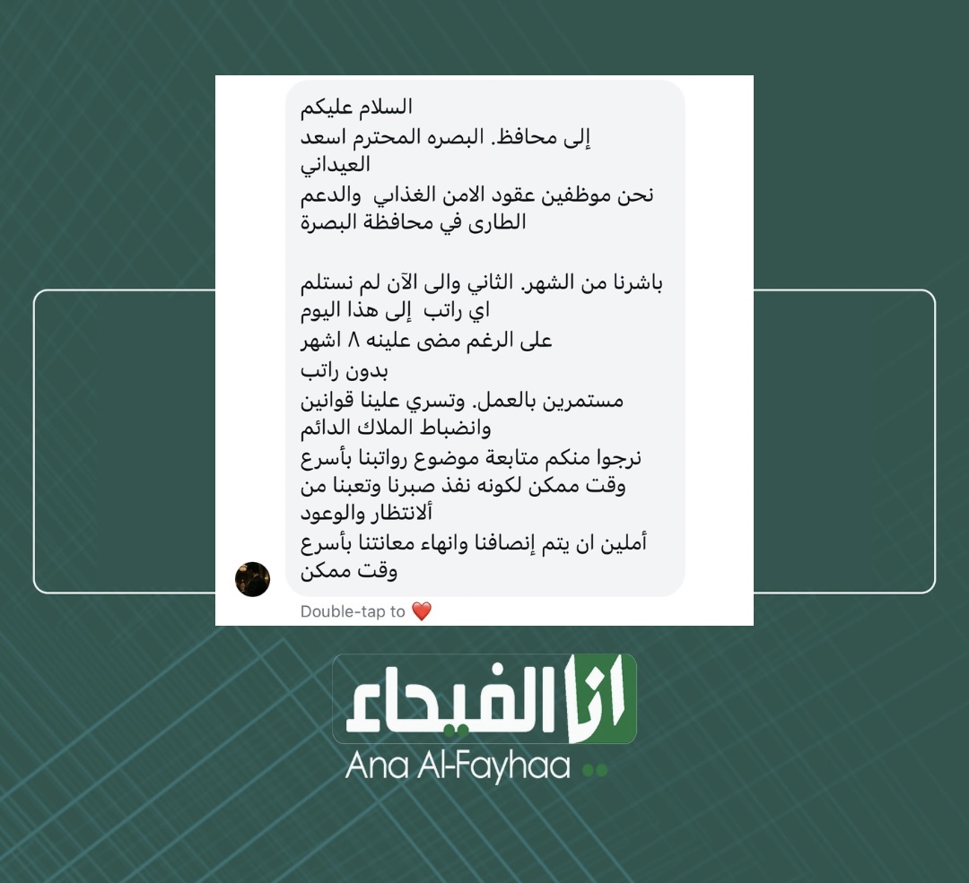 ناشد موظفو عقود الأمن الغذائي والدعم الطارئ في محافظة البصرة، اليوم، المحافظ أسعد العيداني بالتدخل العاجل لإنهاء معاناتهم وصرف رواتبهم المتأخرة منذ ثمانية أشهر.