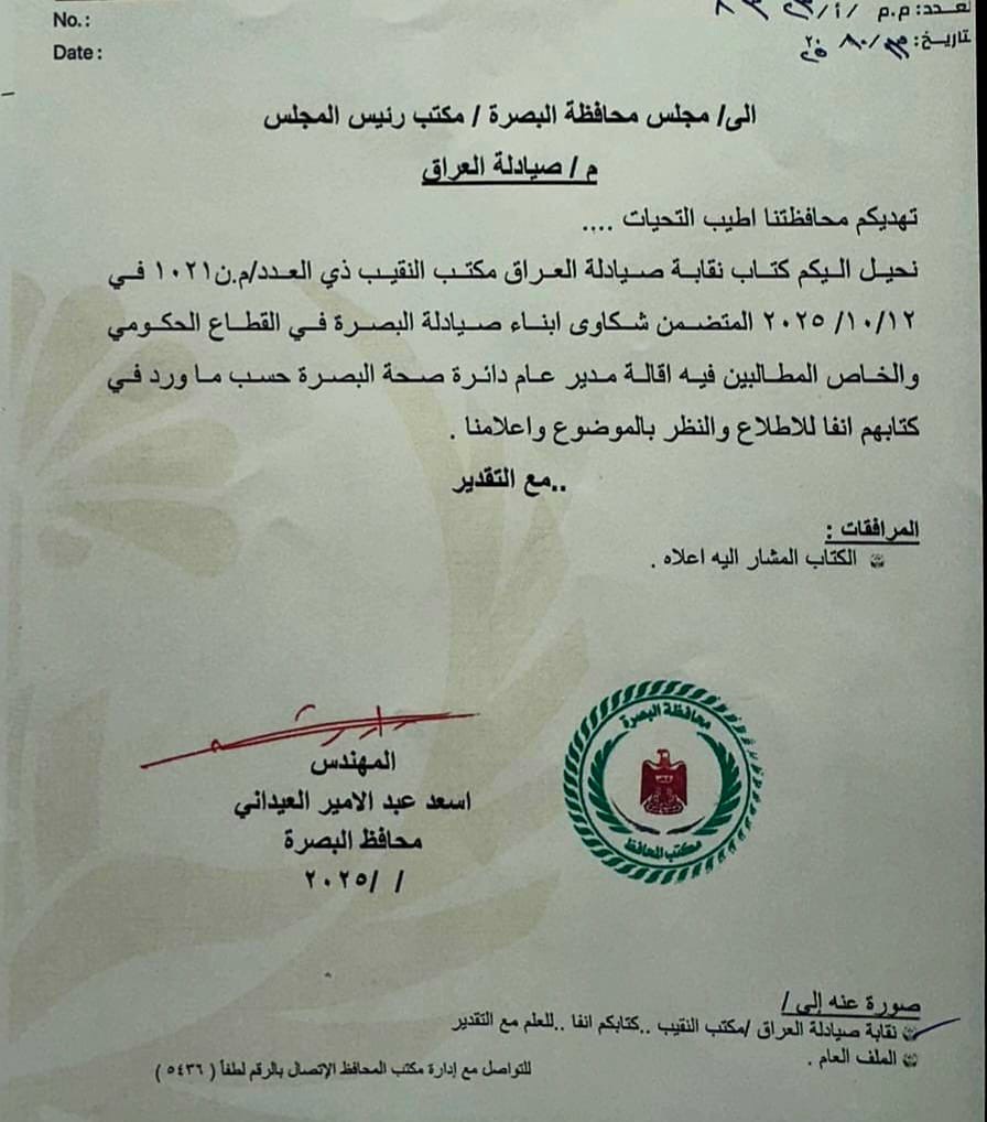 أحال محافظ البصرة أسعد العيداني كتاب نقابة صيادلة العراق / مكتب البصرة إلى مجلس محافظة البصرة / مكتب رئيس المجلس، والمتضمن شكاوى عدد من صيادلة البصرة العاملين في القطاع الحكومي، الذين طالبوا بـ إقالة مدير عام دائرة صحة البصرة.