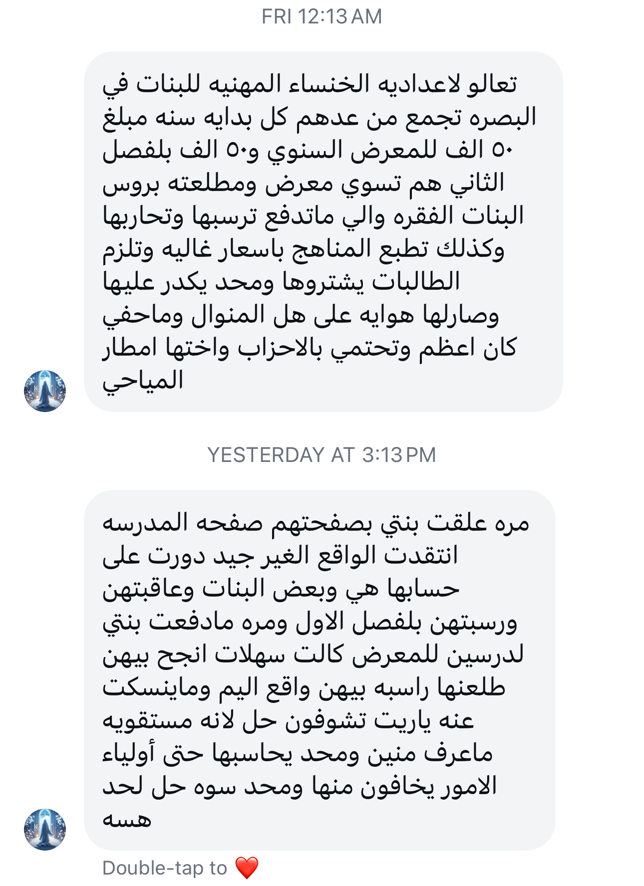 ناشد اولياء الأمور الجهات التربوية والرقابية بعد تفاقم التجاوزات في إعدادية الخنساء المهنية للبنات في البصرة حسب قولهم، حيث أكدوا أن إدارة المدرسة تجمع مبالغ مالية من الطالبات في كل عام بحجة “المعرض السنوي” تصل إلى ٥٠ ألف دينار في بداية السنة و٥٠ ألف بالفصل الثاني، ومن ترفض الدفع تُعامَل بقسوة أو تُهدَّد بالرسوب.