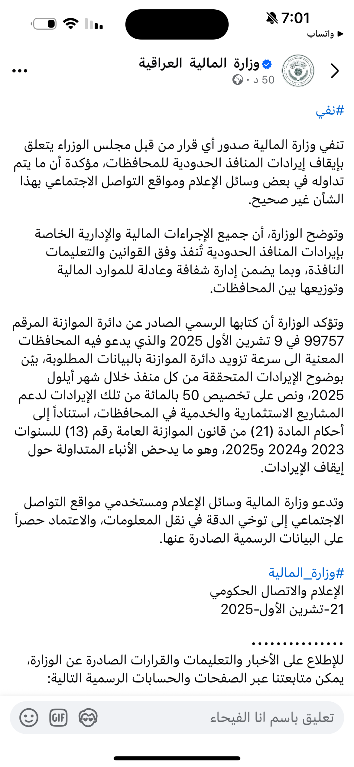 وأوضحت الوزارة في بيان رسمي أن جميع الإجراءات المالية والإدارية الخاصة بإيرادات المنافذ تُنفذ وفق القوانين والتعليمات النافذة، بما يضمن إدارة شفافة وعدالة في توزيع الموارد المالية بين المحافظات.