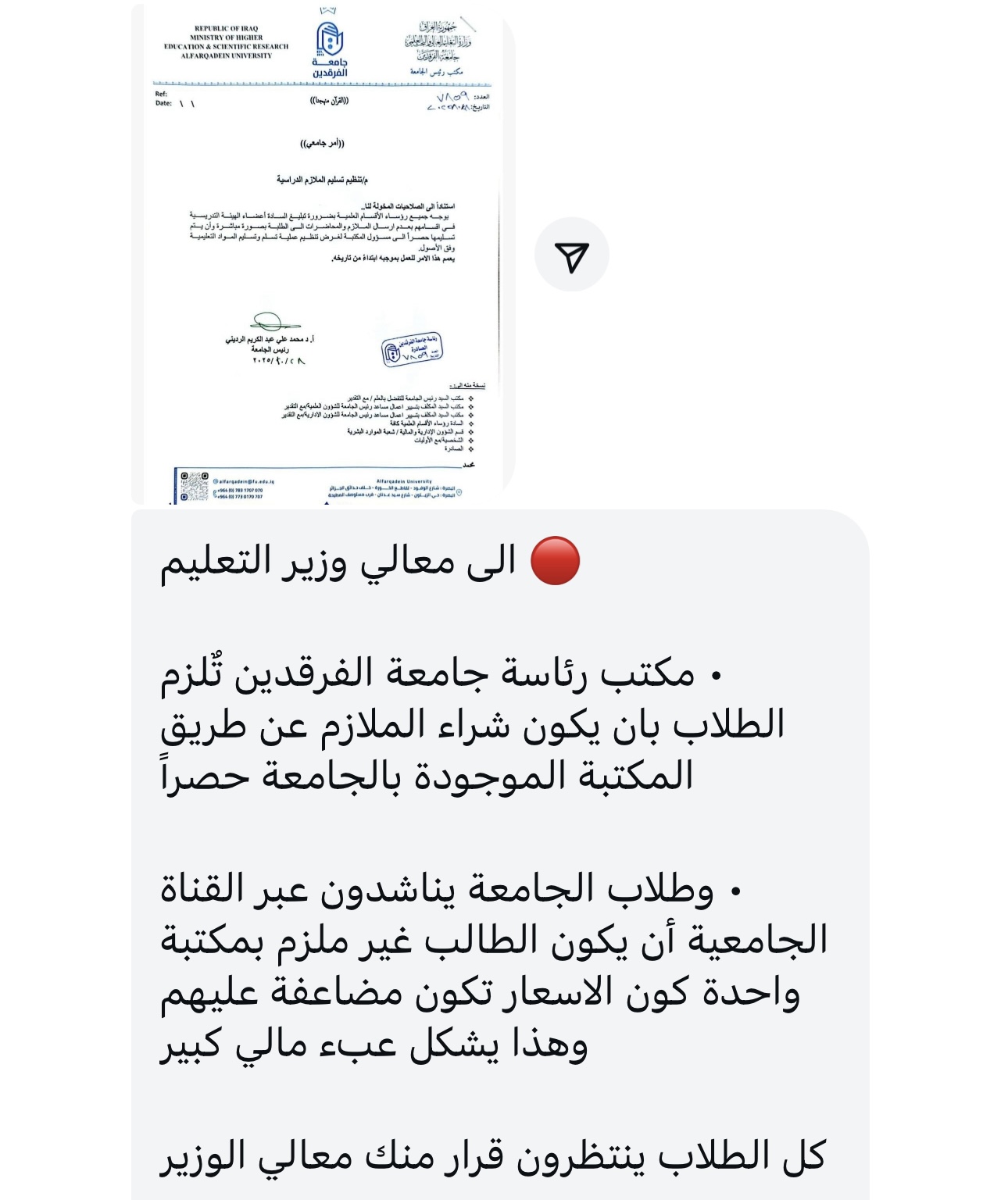 وأوضح الطلبة في مناشدتهم عبر أنا الفيحاء أن هذا الإجراء تسبب بارتفاع أسعار الملازم بشكلٍ مضاعف، مما شكّل عبئاً مالياً كبيراً على الطلبة، مؤكدين أن من حقهم اختيار مصدر شراء المواد الدراسية بحرية دون إلزامٍ أو احتكار.