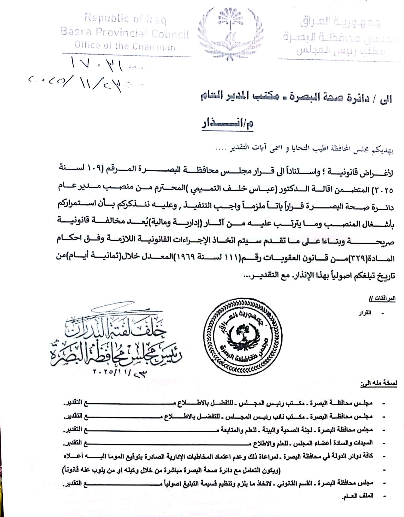 أصدر مكتب رئيس مجلس محافظة البصرة خلف البدران إنذاراً رسمياً موجهاً إلى دائرة صحة البصرة يذكّر فيه بوجوب تنفيذ قرار المجلس القاضي بإقالة الدكتور عباس خلف التميمي من منصب المدير العام، مؤكداً أن القرار بات وملزم وواجب التنفيذ.