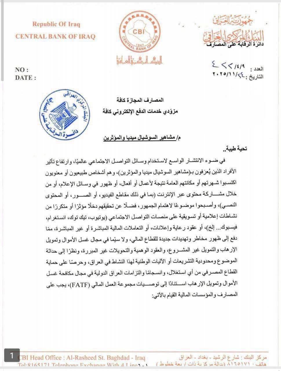 البنك المركزي العراقي يحذر.. مشاهير السوشيال ميديا والمؤثرين عمـ.ـلاء ذو مخاطر