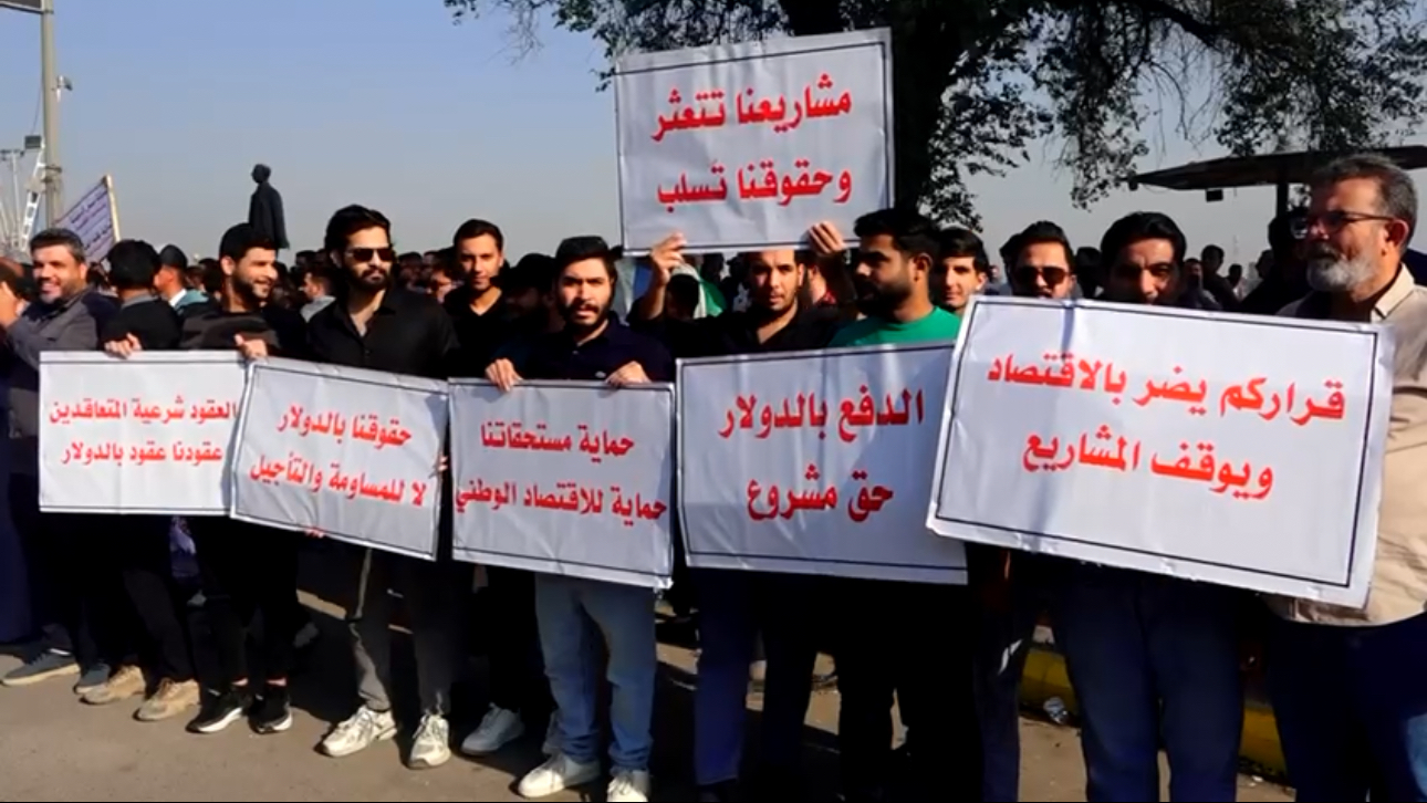 مقاولو البصرة يتظاهرون أمام البنك المركزي احتجاجاً على إيقاف الحوالات بالدولار وتداعياته على المشاريع المحلية