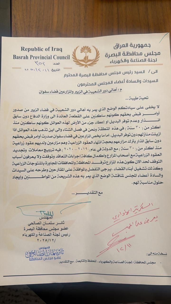 وأشار الصالحي إلى أن عوائل الشعيبة مهددة بإخلاء منازل تسكنها منذ أكثر من ثلاثة عقود من دون توفير بديل، في وقت يتزامن مع اقتراب موسم الشتاء. كما أوضح أن مزارعي سفوان يواجهون أوامر مشابهة رغم امتلاكهم عقوداً زراعية ممتدة لسنوات طويلة، واستمرار معاملاتهم بالتجديد حتى عامي 2019 و2020.
