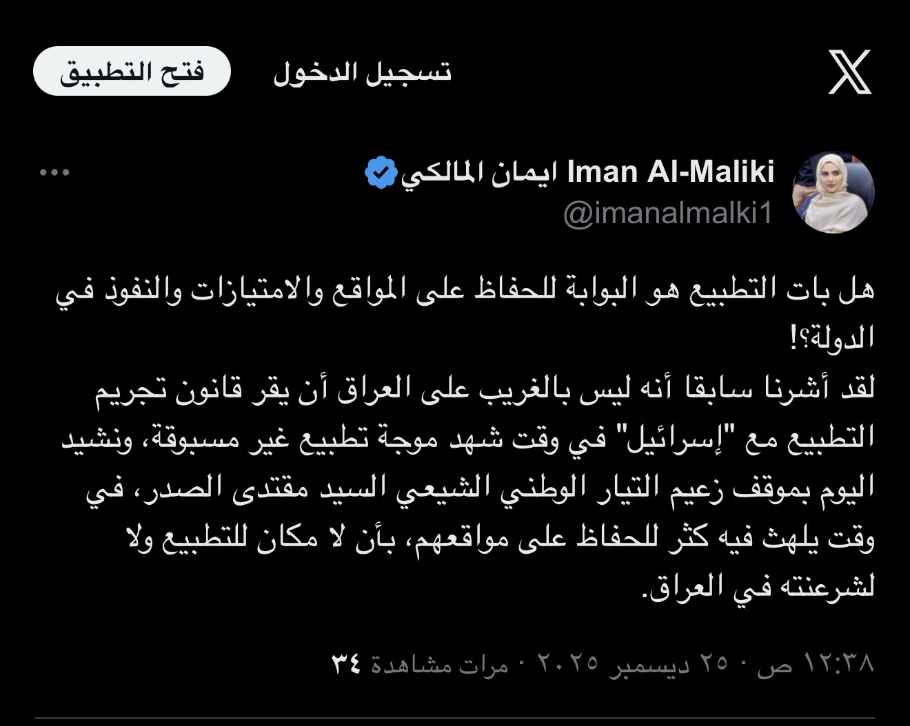 تساءلت رئيس لجنة حقوق الإنسان والمرأة والطفل في مجلس محافظة البصرة، إيمان المالكي، عبر منشور لها على منصة X، عمّا إذا كان التطبيع قد بات بوابةً للحفاظ على المواقع والامتيازات والنفوذ داخل الدولة.