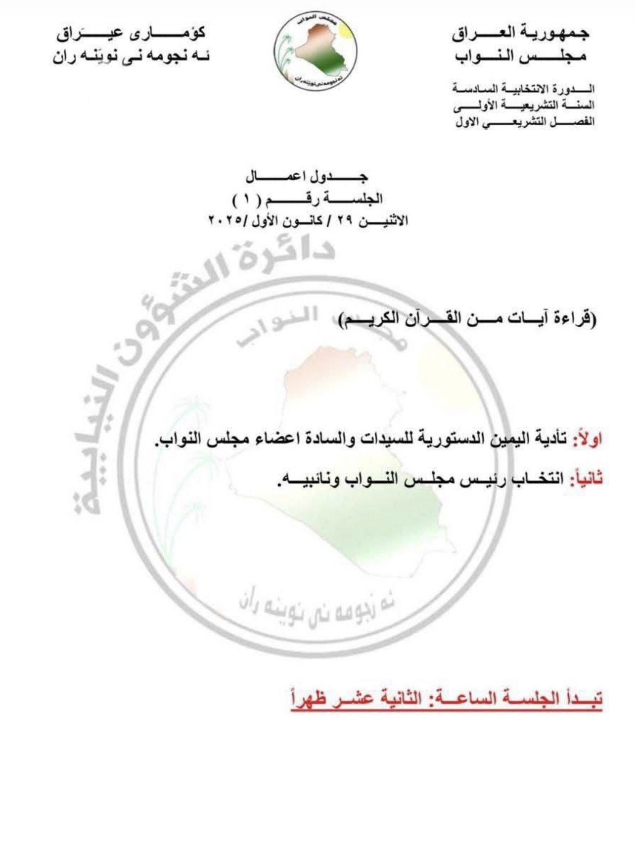 يعقد مجلس النواب العراقي، يوم غد الاثنين، جلسته الأولى للدورة الجديدة عقب الانتخابات، حيث تتضمن جدول الأعمال تأدية اليمين الدستورية للسيدات والسادة أعضاء المجلس، يليها انتخاب رئيس مجلس النواب ونائبيه.